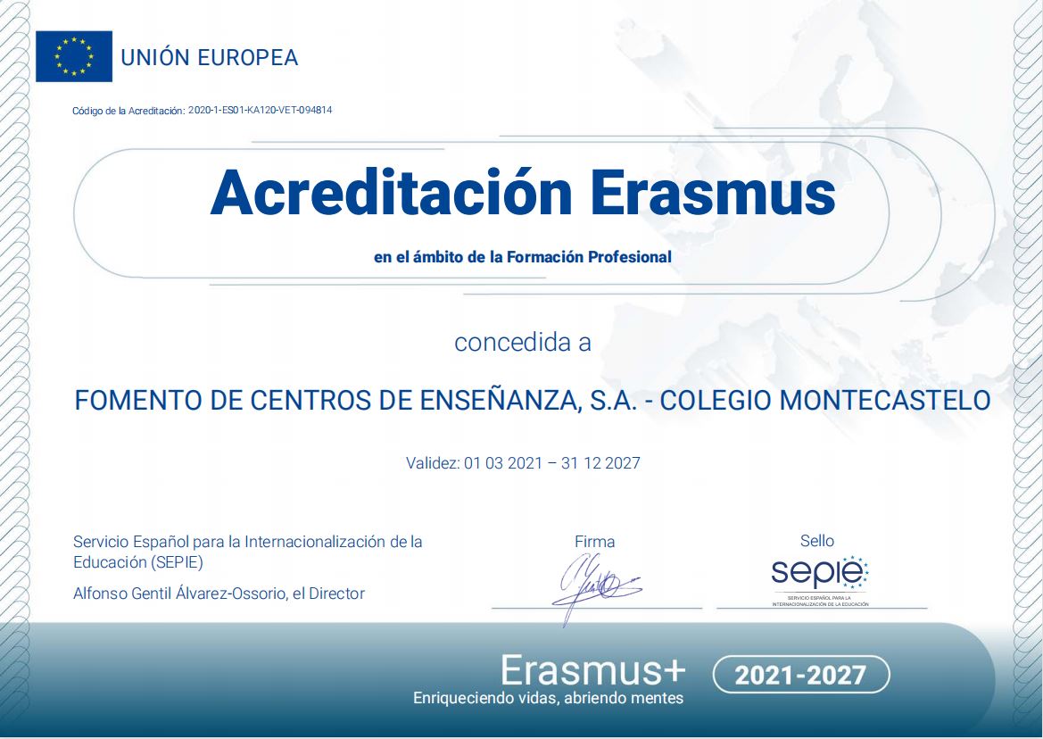 El colegio Montecastelo tiene concedida la Carta Erasmus de Educación Superior 2021-2027 que posibilita a nuestros alumnos realizar el período de prácticas en empresas (Formación en Centros de Trabajo) en otro país de la UE. Los alumnos interesados realizan un curso de idioma y, si lo superan, obtienen una Beca Erasmus para sufragar los gastos de viaje, alojamiento y manutención derivados de su estancia en el extranjero.